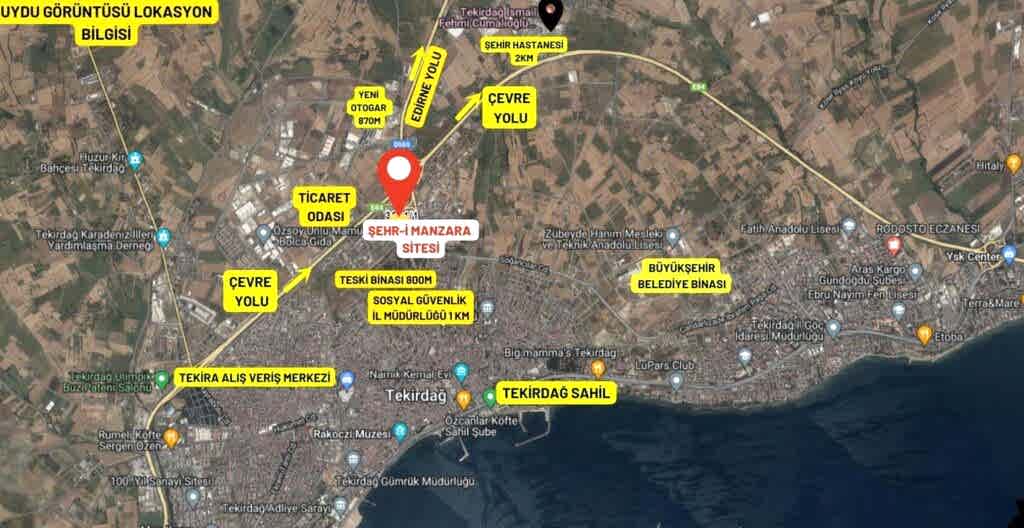 1. Kattan itibaren deniz ve doğa manzaralı, Tekirdağ İstanbul çevre yoluna 200m, şehir otogarı 600m, Tekirdağ İsmail Fehmi Cumalıoğulu şehir hastanesine 3 km, Özel Tekirdağ Star medica hastanesi 1,7km, Tekirdağ devlet hastanesi 1. kısım 1.3km, yeni sanayi sitesi 5km, dumansız sanayi bölgesi 2,6 km, Tekirdağ sahil 2.3 km